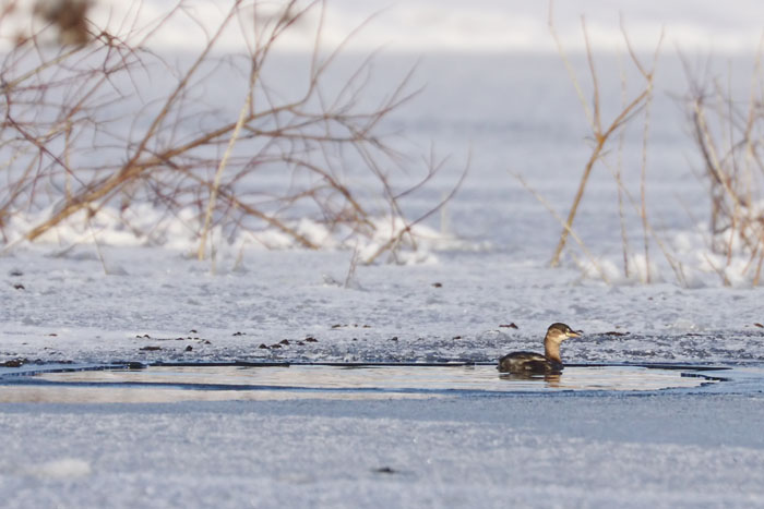9 January 2010 The entire pit was frozen apart from this tiny hole, which contained two Little Grebe! They were diving actively and I saw one catch something, but this was clearly a precarious situation for them. No other duck around - hopefully they have found somewhere less ice bound. |